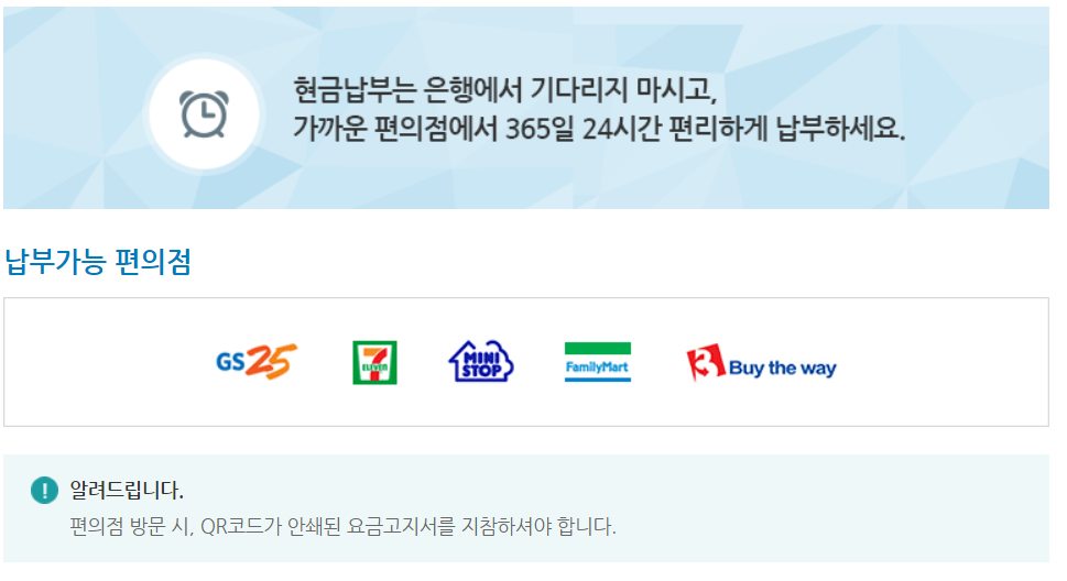 납부할 때 QR코드가 있는 요금고지서를 가지고 가셔야 합니다.