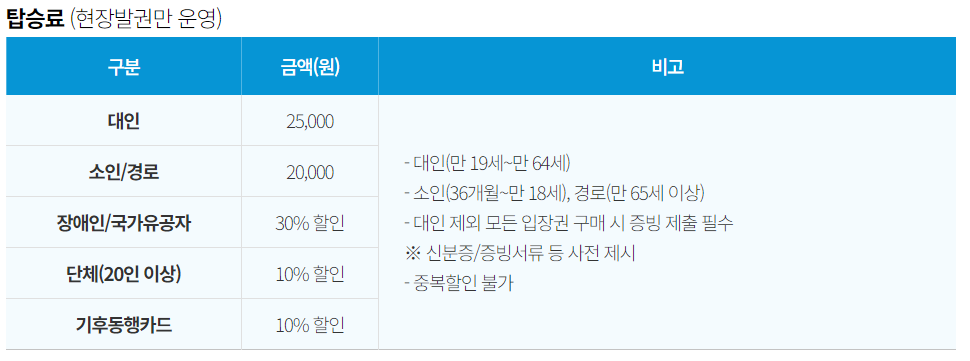 | 할인 혜택 | 장애인, 국가유공자: 30% 할인 단체(20인 이상): 10% 할인 |