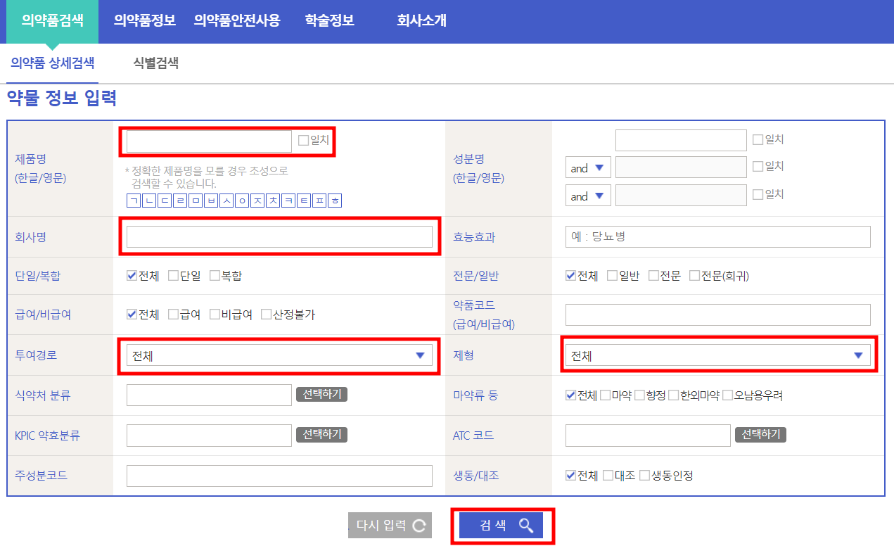 의약품 검색 탭에서 의약품 상세검색탭을 눌러 현재 먹고 있는 약 또는 궁금한 약을 입력하시면 됩니다.