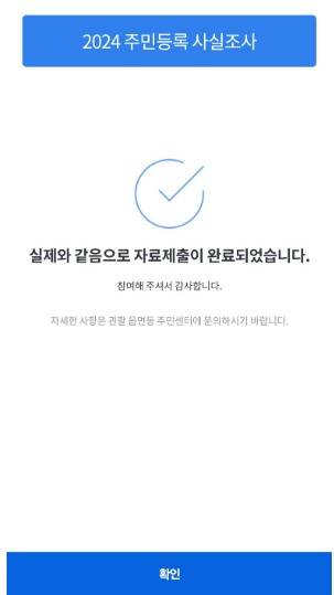 답변3 정부24시 앱을 통해 비대면 조사를 완료한 후 별도의 추가 작업은 필요하지 않습니다. 다만, 조사 결과 실거주와 주민등록 사항이 다를 경우, 담당 공무원이 추가 확인 조사를 실시할 수 있습니다. 필요 시 지방자치단체에서 직권으로 수정 절차를 진행하게 되니, 정확한 정보를 입력해 주세요. 비대면 조사에 참여한 세대라도 중점 조사 대상에 해당하면 방문 조사가 진행될 수 있으므로 참고하시기 바랍니다.