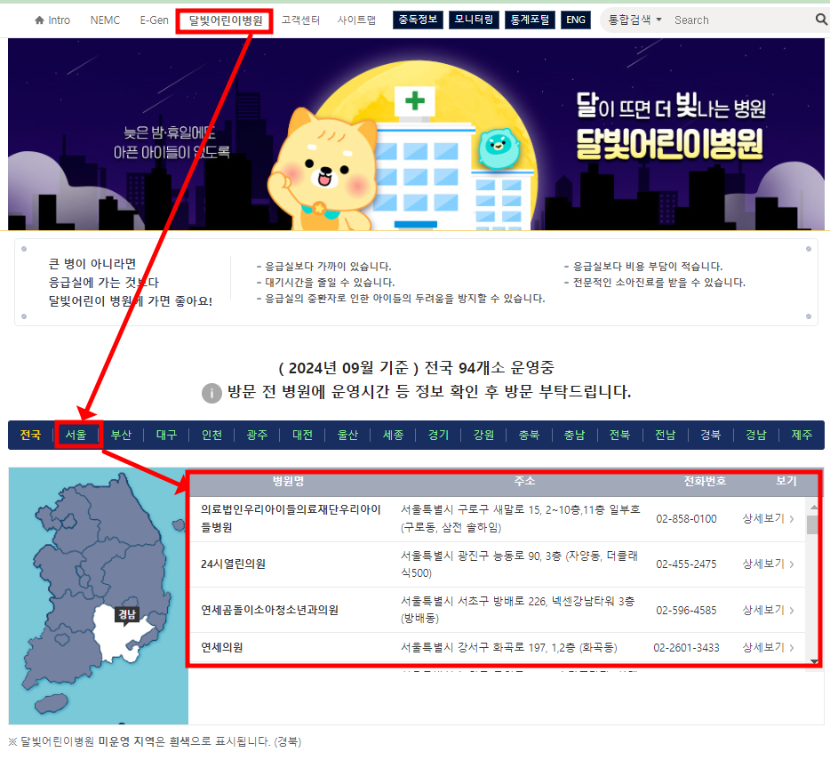 달빛어린이병원 운영 안내 및 검색 방법