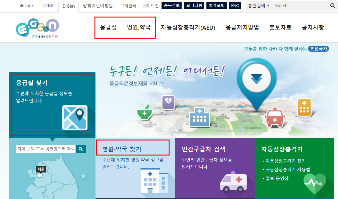 보건복지부에서 제공하는 E-GEN 앱을 이용하시면 병원 약국 응급실 어린이 병원등 모든 정보를 한 번에 이용할 수 있습니다.