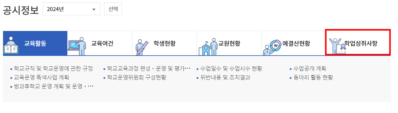 학교정보 하단에 공시정보가 있습니다. 학업성취사항을 선택하시면 정보를 확인할 수 있습니다.